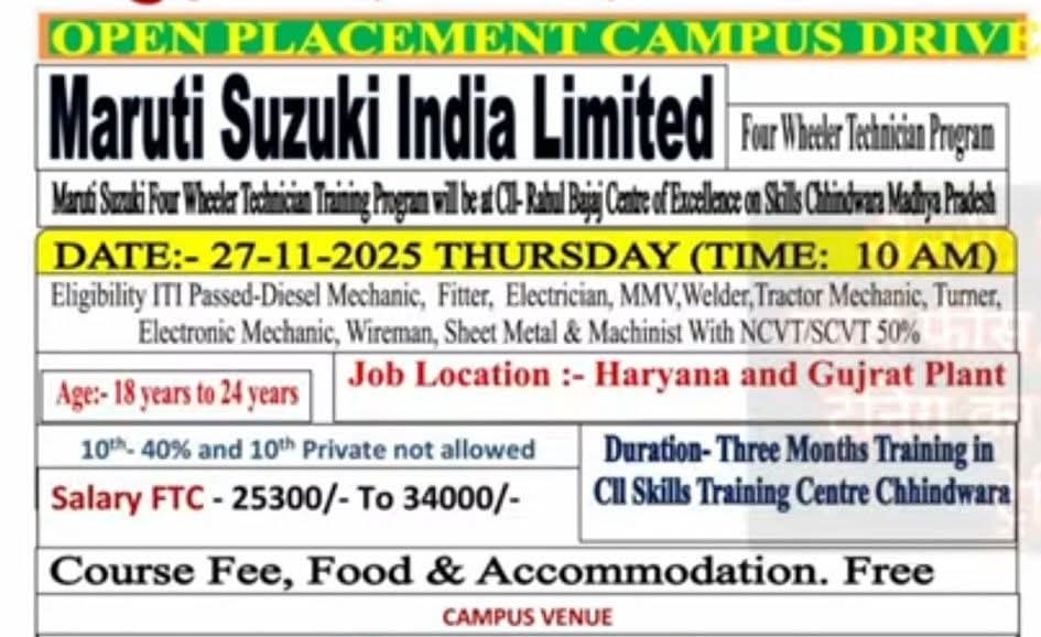 The Office of the Principal, Government Model Industrial Training Institute, Sector-5, Rohtak has issued a notice stating that on 27-11-2025, a Job Fair / Campus Placement will be organized at Government ITI Rohtak for Jai Bharat Maruti Ltd., Kharkhoda Plant.