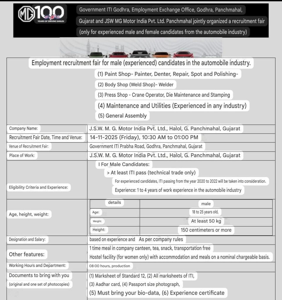 MG Motors Ltd Halol Vacancy 2025. Government ITI Godhra, Employment Exchange Office Godhra Panchmahal, Gujarat and JSW MG Motor India Pvt. Ltd. Panchmahal ने संयुक्त रूप से एक रोजगार मेला आयोजित किया है, jointly organized a recruitment fair, जो केवल अनुभवी पुरुष और महिला उम्मीदवारों के लिए है, जो ऑटोमोबाइल उद्योग से संबंधित हैं. This is only for experienced male and female candidates, who are related to the automobile industry.
